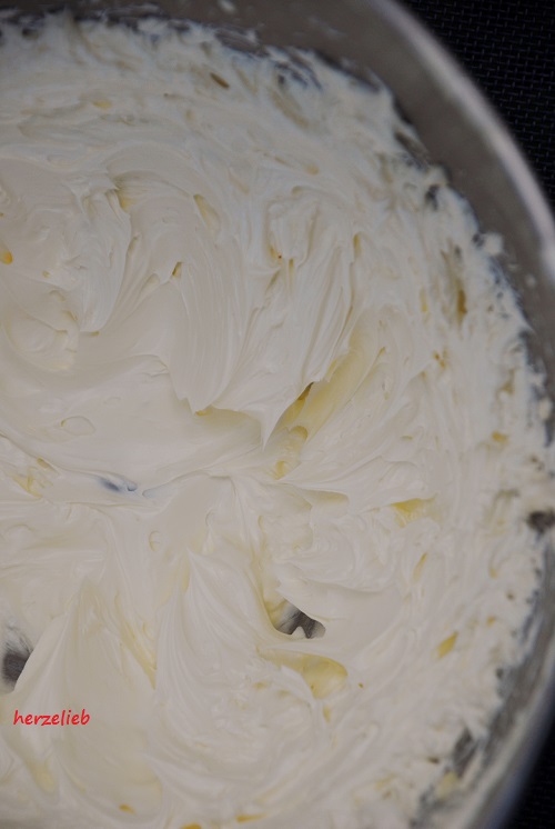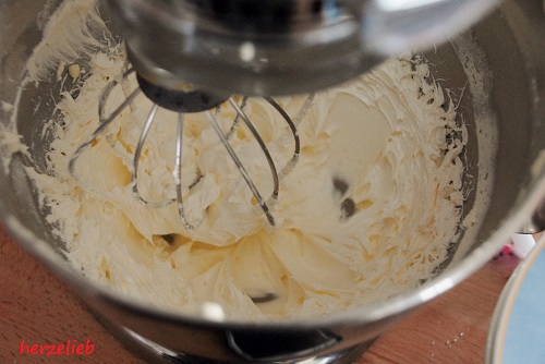 Die zimmerwarme Butter schlägst du mit einem Rührbesen auf höchster Stufe mindestens 15 Minuten auf, bis sie weißcremig ist. Das dauert leider so lange, aber die Creme wird dann schön fluffig und locker.